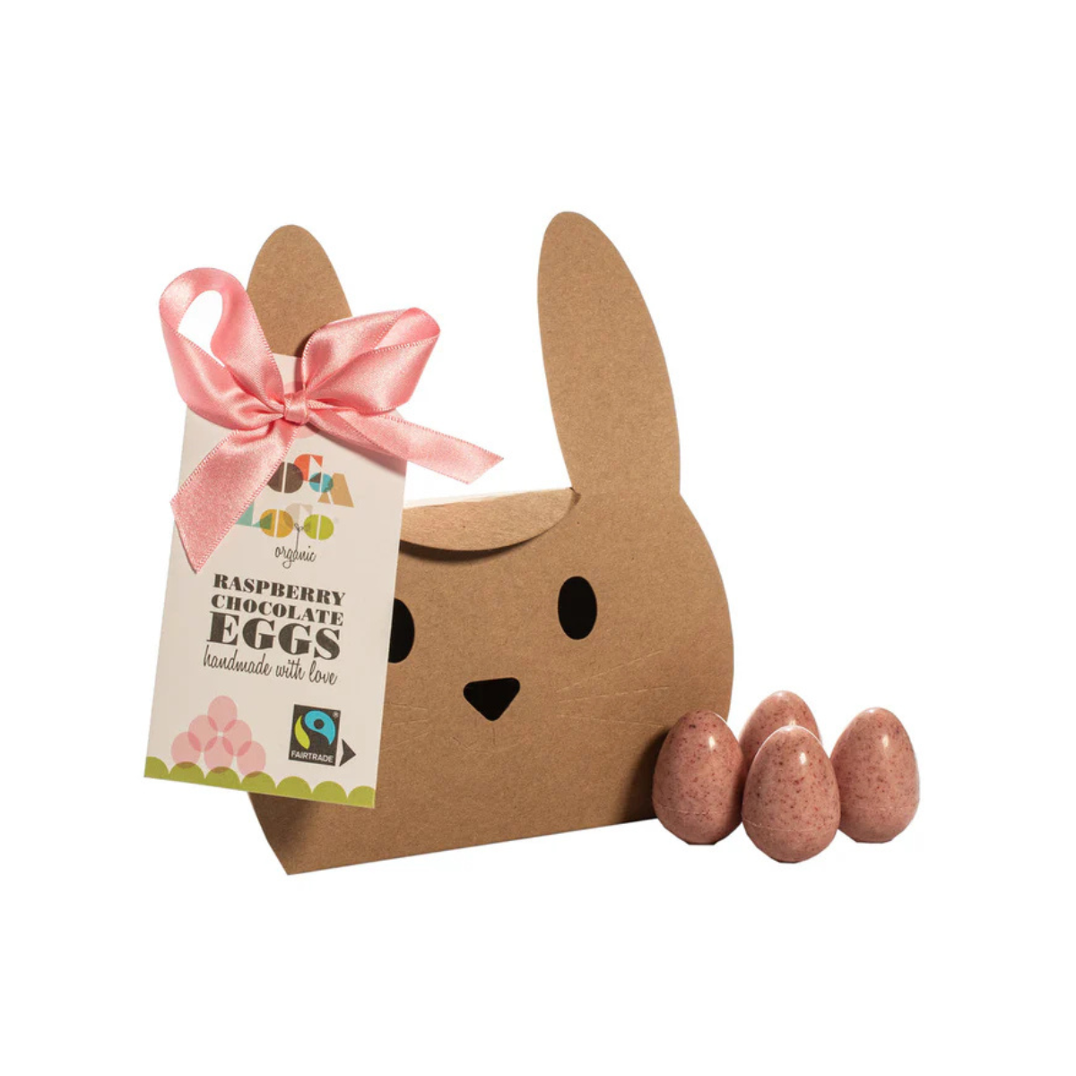 Cocoa Loco Organic Mini Eggs White Choc & Raspberry are creamy white chocolate treats with a burst of fruity raspberry flavour in every bite. These gluten-free mini eggs are perfect for Easter gifting or enjoying as a sweet, tangy indulgence.